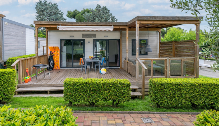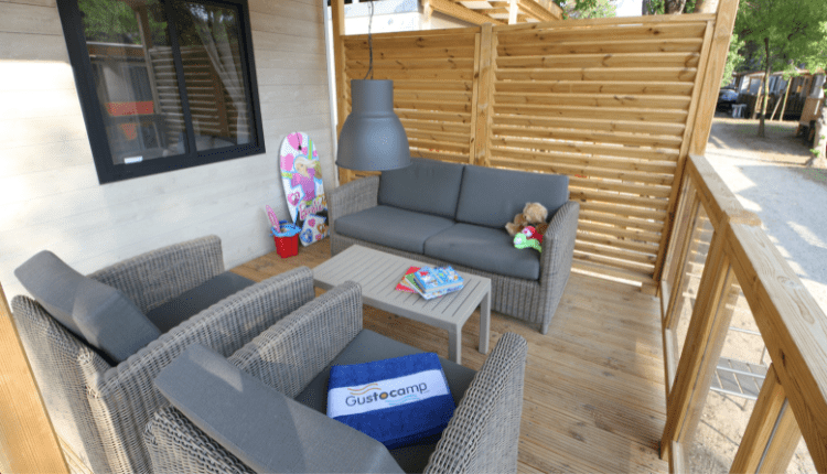 De stacaravan is voorzien van airconditioning en een groot houten terras met luxe loungeset en overkapping voor optimaal buitencomfort.