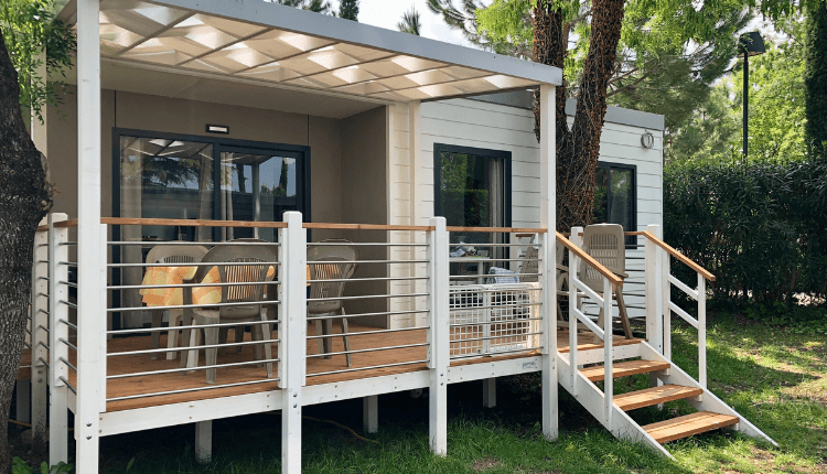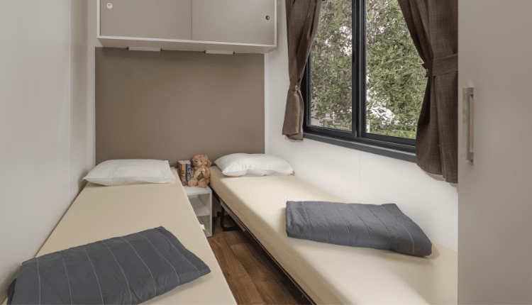 De Solare Deluxe biedt luxe voor 5 personen. Deze stacaravan heeft 2 slaapkamers, veel opbergruimte en een volledig uitgeruste keuken met hoge koelkast en 4-pits gasfornuis. Aan de voorzijde is een houten terras met gedeeltelijke overkapping, ideaal om tijdens de heetste uren of tijdens een regenbui onder te genieten.