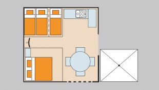 De bungalowtent heeft ruime, hoge slaapcabines met comfortabele bedden met goede matrassen. De eerste slaapcabine van de bungalowtent heeft een tweepersoonsbed, de 2e slaapcabine 3 eenpersoonsbedden. Een 6e bed is op verzoek bij te plaatsen in het woongedeelte en dekens en kussens zijn aanwezig. In het gangetje tussen de 2 slaapcabines van de bungalowtent Gusto vindt je een garderobekast en een rek waar je de kleding kunt weghangen.
