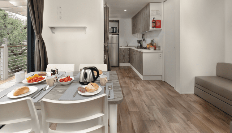 De Solare Deluxe biedt luxe voor 5 personen. Deze stacaravan heeft 2 slaapkamers, veel opbergruimte en een volledig uitgeruste keuken met hoge koelkast en 4-pits gasfornuis. Aan de voorzijde is een houten terras met gedeeltelijke overkapping, ideaal om tijdens de heetste uren of tijdens een regenbui onder te genieten.
