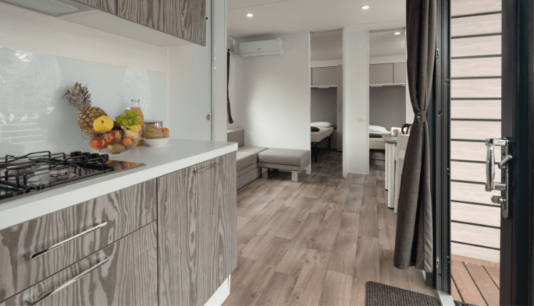 De Solare Deluxe biedt luxe voor 5 personen. Deze stacaravan heeft 2 slaapkamers, veel opbergruimte en een volledig uitgeruste keuken met hoge koelkast en 4-pits gasfornuis. Aan de voorzijde is een houten terras met gedeeltelijke overkapping, ideaal om tijdens de heetste uren of tijdens een regenbui onder te genieten.