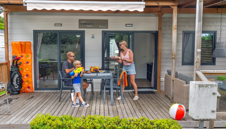 De stacaravan is voorzien van airconditioning en een groot houten terras met luxe loungeset en overkapping voor optimaal buitencomfort.