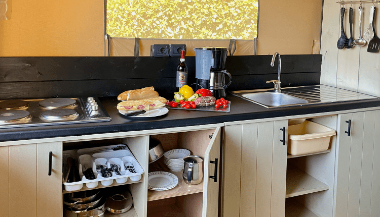 De Safaritent Gusto Premium heeft een gezellige woonruimte met een tafel met stoelen en een zithoek. De keuken van de tent is uitgerust met een 4 pits kooktoestel, stromend water en een hoge koelkast met vriesvak, waardoor je zelfs de ijsjes van de kinderen ingevroren kunt houden.
