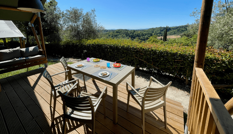 Ook voor deze vorm van glamping kun je nu bij Gustocamp terecht. De Safaritent Gusto Premium met eigen sanitair staan exclusief in de Lodge Village op camping hu Norcenni Girasole village in hartje Toscane. De Safaritent Gusto Premium is een comfortabele, ruime tent (28 m²) met een groot houten terras en airco.