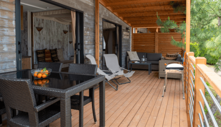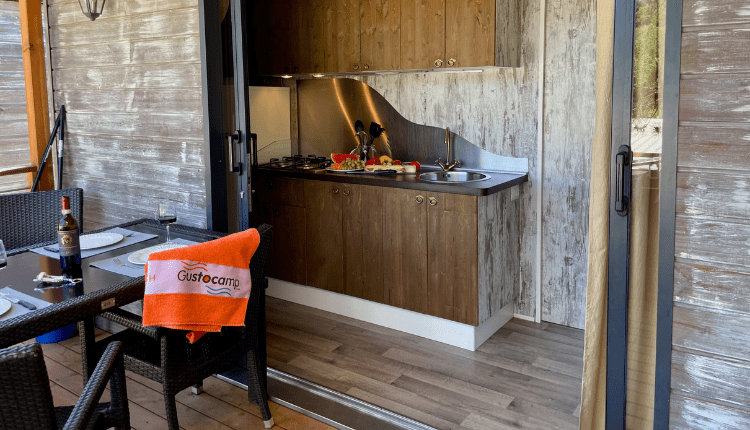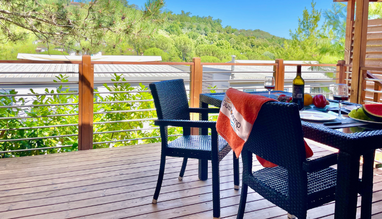 De stacaravan Savanna Deluxe heeft een half overdekt houten terras voorzien van luxe tuinmeubilair. Natuurlijk ontbreekt de gasbarbecue niet. Vanaf het terras heb je een prachtig uitzicht over camping Norcenni Girasole Club.