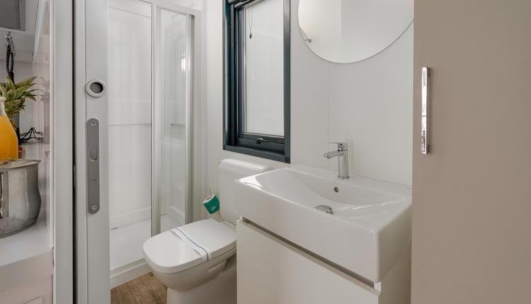 De ruime badkamer van een stacaravan Solare Deluxe is uitgerust met een ruime douchecabine en een wastafelmeubel met afsluitbaar kastje, een spiegel en toilet.