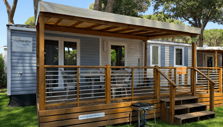 De stacaravan Sunset Superior beschikt over een comfortabel en volledig overdekt houten terras, zodat je ook gedurende de heetste uren van de dag of tijdens een regenbui van het terras kunt genieten.