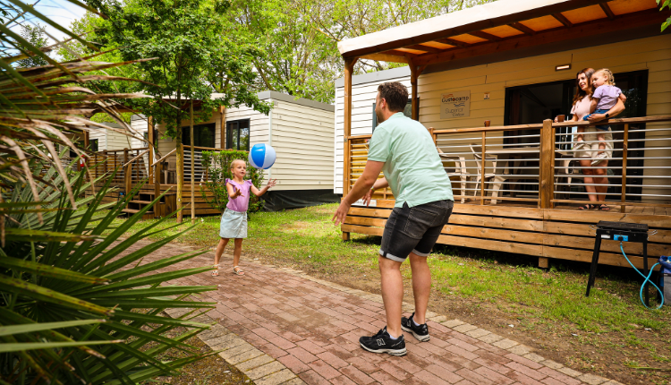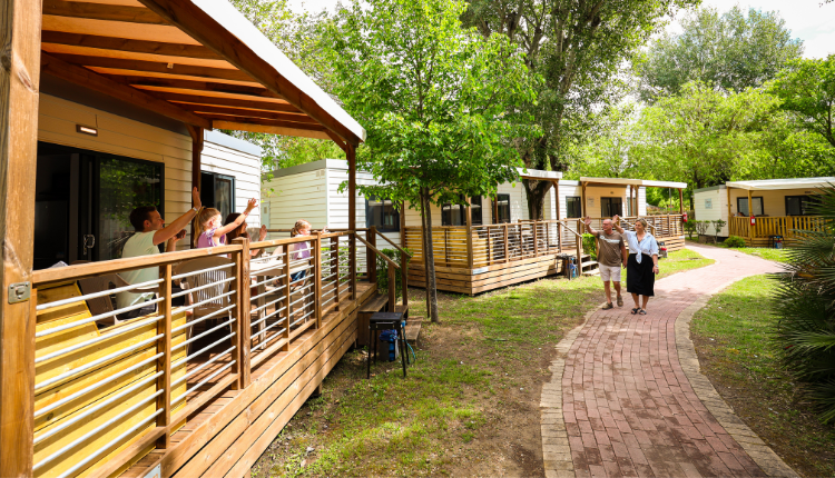 Terras: met (gedeeltelijke) overkapping en volledig tuinmeubilair met barbecue. Op sommige campings is het mogelijk om het terras af te sluiten met een hekje.