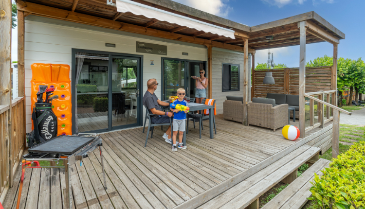 Buiten beschikt de stacaravan over een houten terras met gedeeltelijke overkapping, volledig tuinmeubilair, een comfortabele loungeset en een barbecue. Deze luxe buitenruimte is ideaal om te ontspannen, samen buiten te eten en te genieten van lange zomeravonden op de camping.Afgebeeld model kan afwijken van werkelijkheid. Wijzigingen voorbehouden.